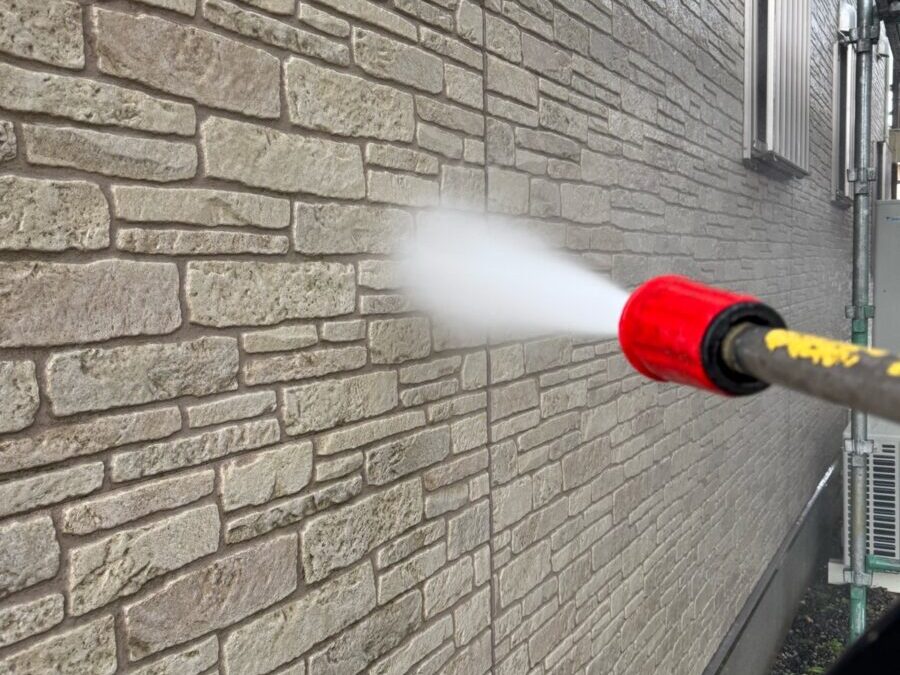 高圧洗浄で外壁の古い塗膜や汚れを除去します。塗料の密着をよくし、色ムラや塗膜の剥がれを防ぎます。