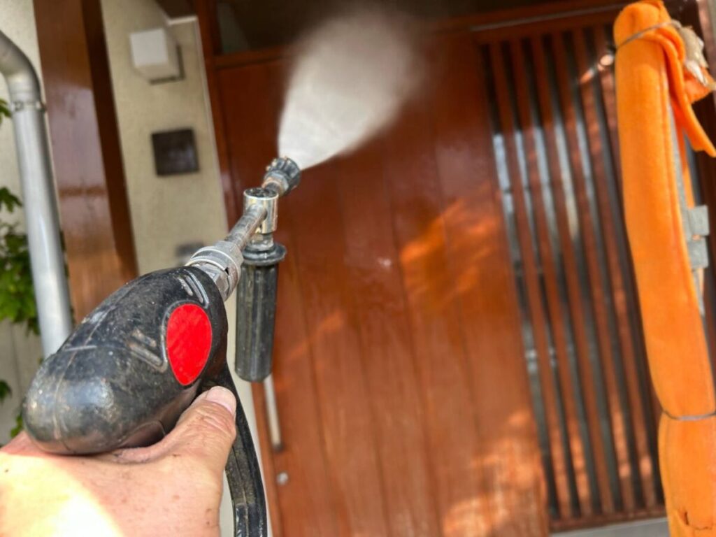 外壁の表面に付着した汚れや古い塗膜を高圧洗浄できれいに落としていきます。しっかり洗浄することで、塗料が均一に密着します。