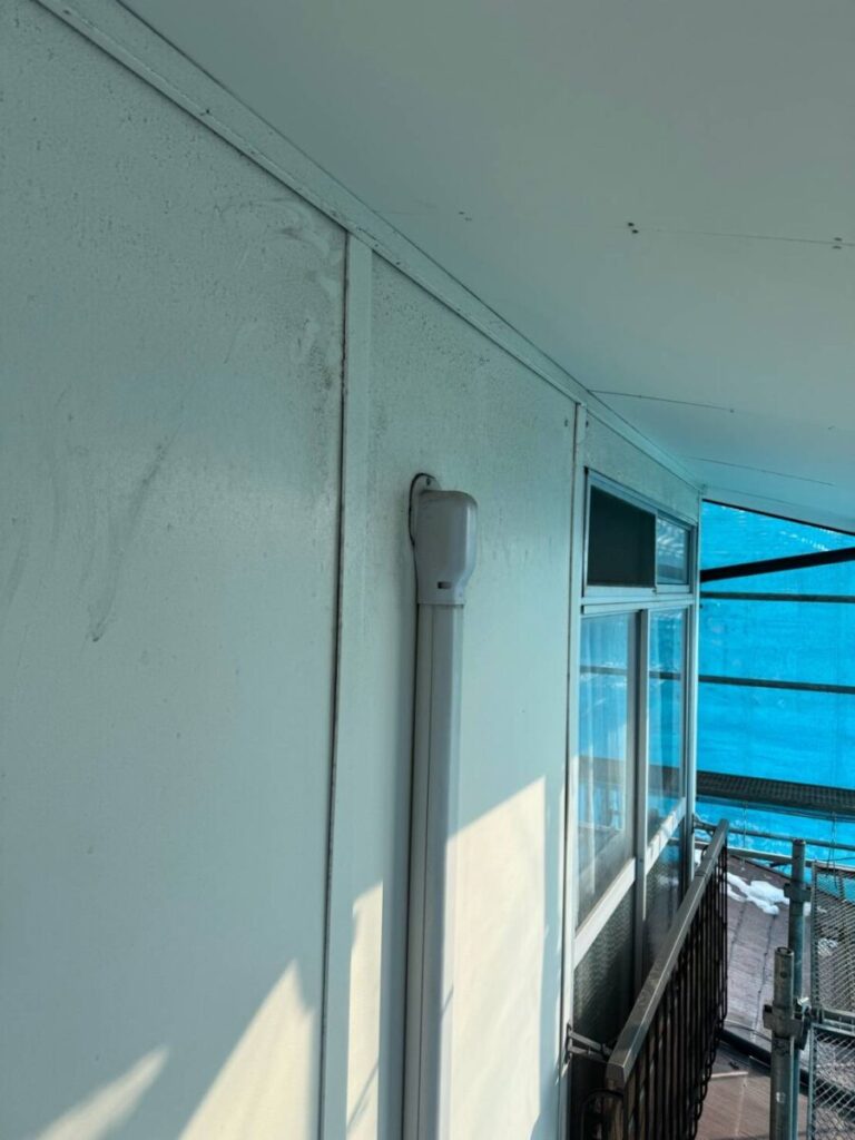 屋根のコケや色褪せ、外壁のチョーキング現象(外壁を手で触れると白い粉が付く劣化症状)や雨だれ等が確認されました。これらは外壁の美観を損なうだけでなく、防水機能の低下にもつながるため、早めのメンテナンスが必要な状態でした。足場を一度で済ませることでコストを抑えつつ、建物全体をしっかりと保護します。