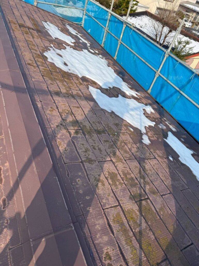 屋根は経年劣化による色褪せと、広範囲にわたりコケが発生している状態でした。