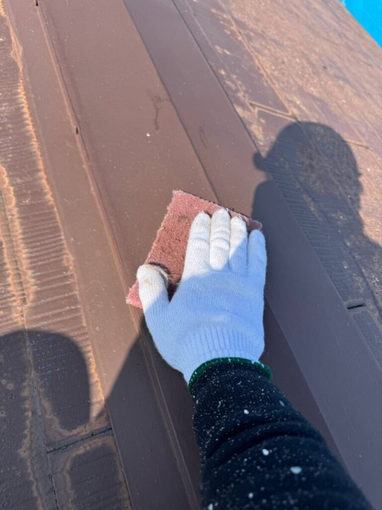 屋根の表面に付着したサビや汚れ、古い塗膜を除去する「ケレン作業」を行います。この工程を丁寧に行うことで、塗料の密着性が高まり、仕上がりの美しさと耐久性が向上します。