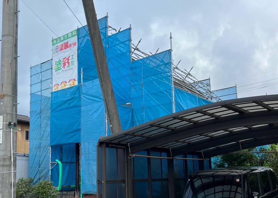 安全に作業を行うため足場を設置します。建物全体を囲むことで、塗装作業中の飛散を防ぎながら、安心して作業を進められるよう準備を整えます。
