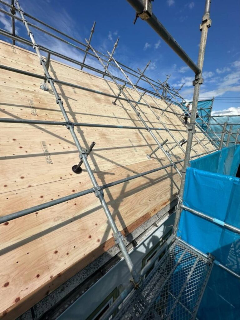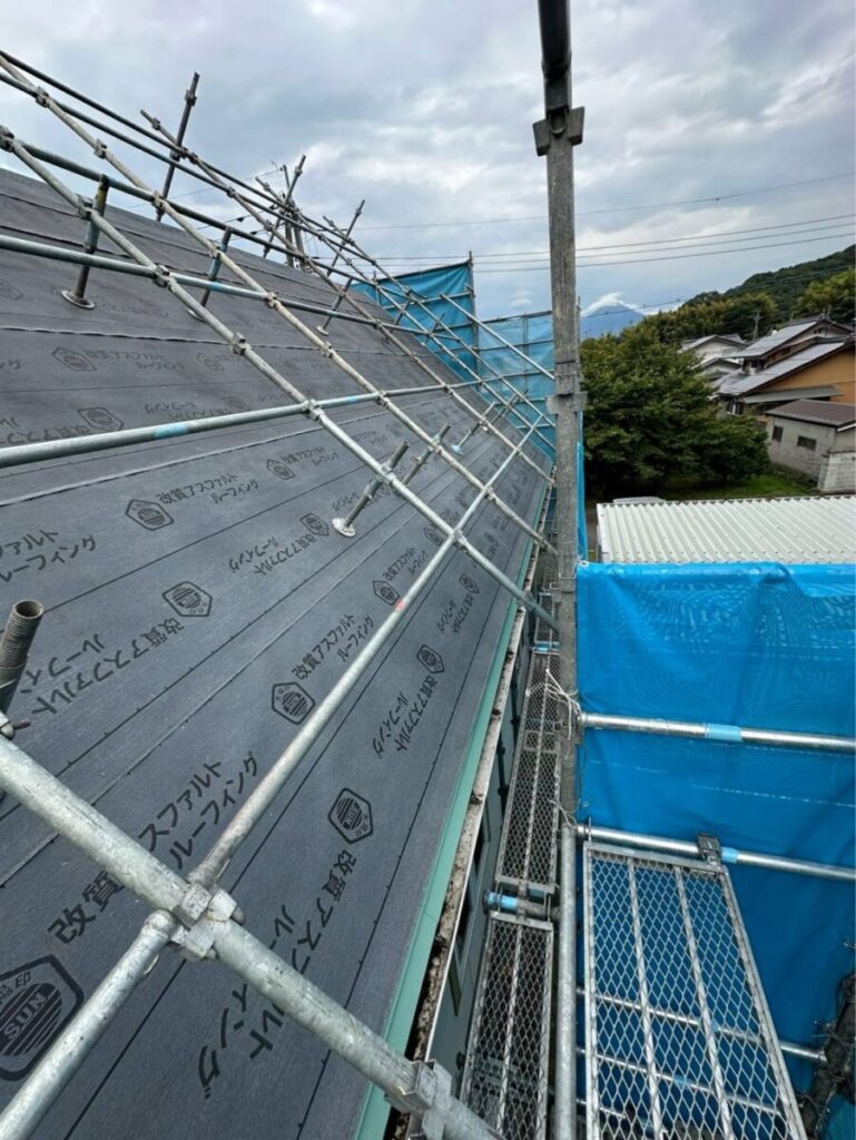ルーフィングという防水紙を敷設します。上下の防水紙を10cmほど重ねて敷くことで仮に屋根材の下に水分が入り込んでも屋根まで浸透しなくなります。