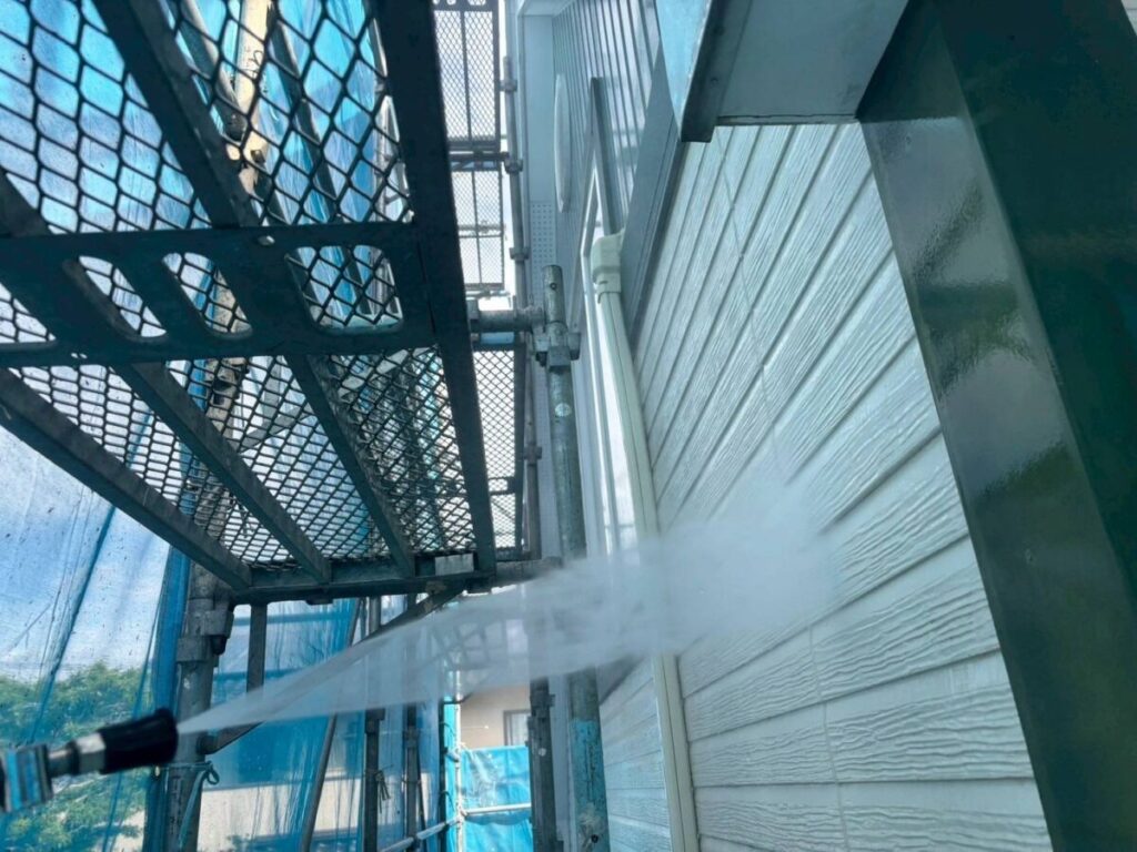 外壁の表面に付着した古い汚れや古い塗膜を高圧洗浄できれいに落としていきます。しっかり洗浄することで、塗料が均一に密着します。