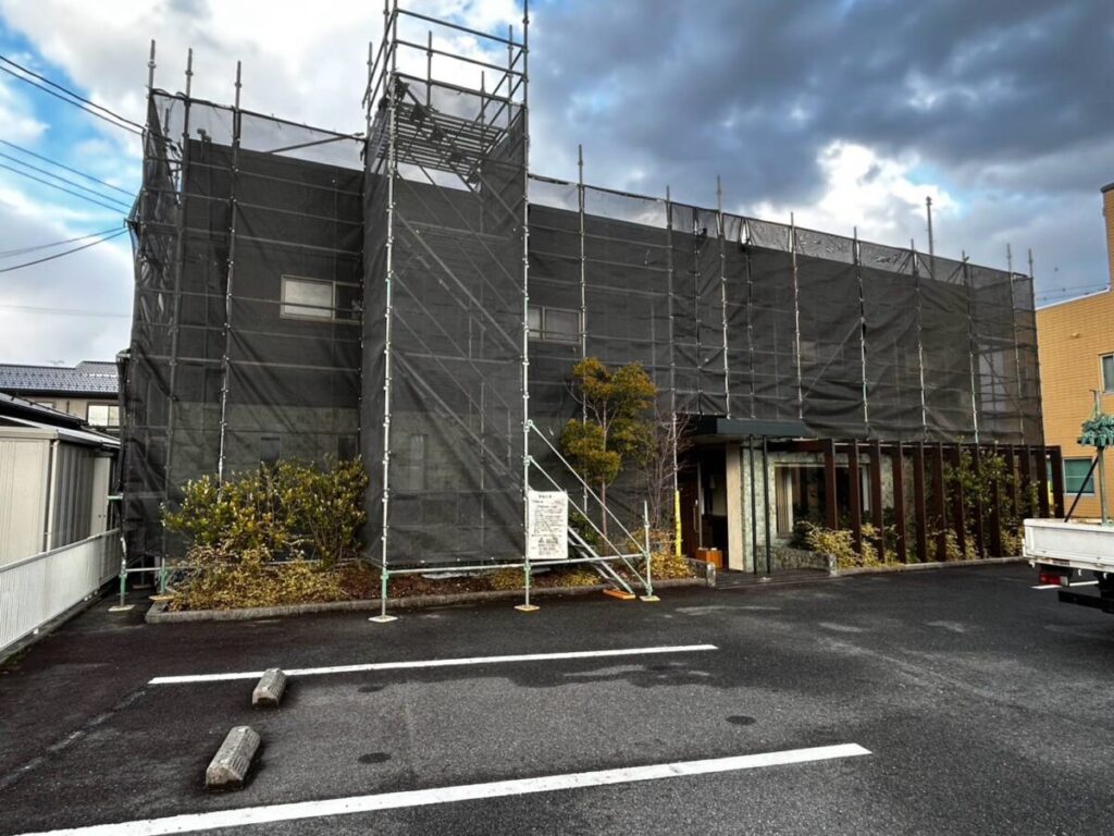 安全に作業を行うため足場を設置しました。 建物全体を囲むことで、塗装作業中の飛散を防ぎながら、安心して作業を進められるよう準備を整えていきます。